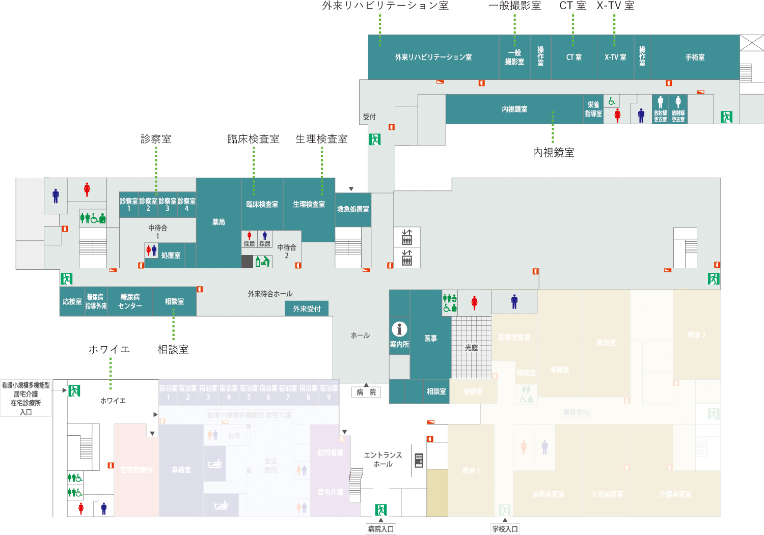 | 1階 | 病院案内カウンター、外来受付・外来・検査室・放射線/CT・内視鏡室・外来リハビリテーション室・栄養指導室・糖尿病指導外来・糖尿病センター |